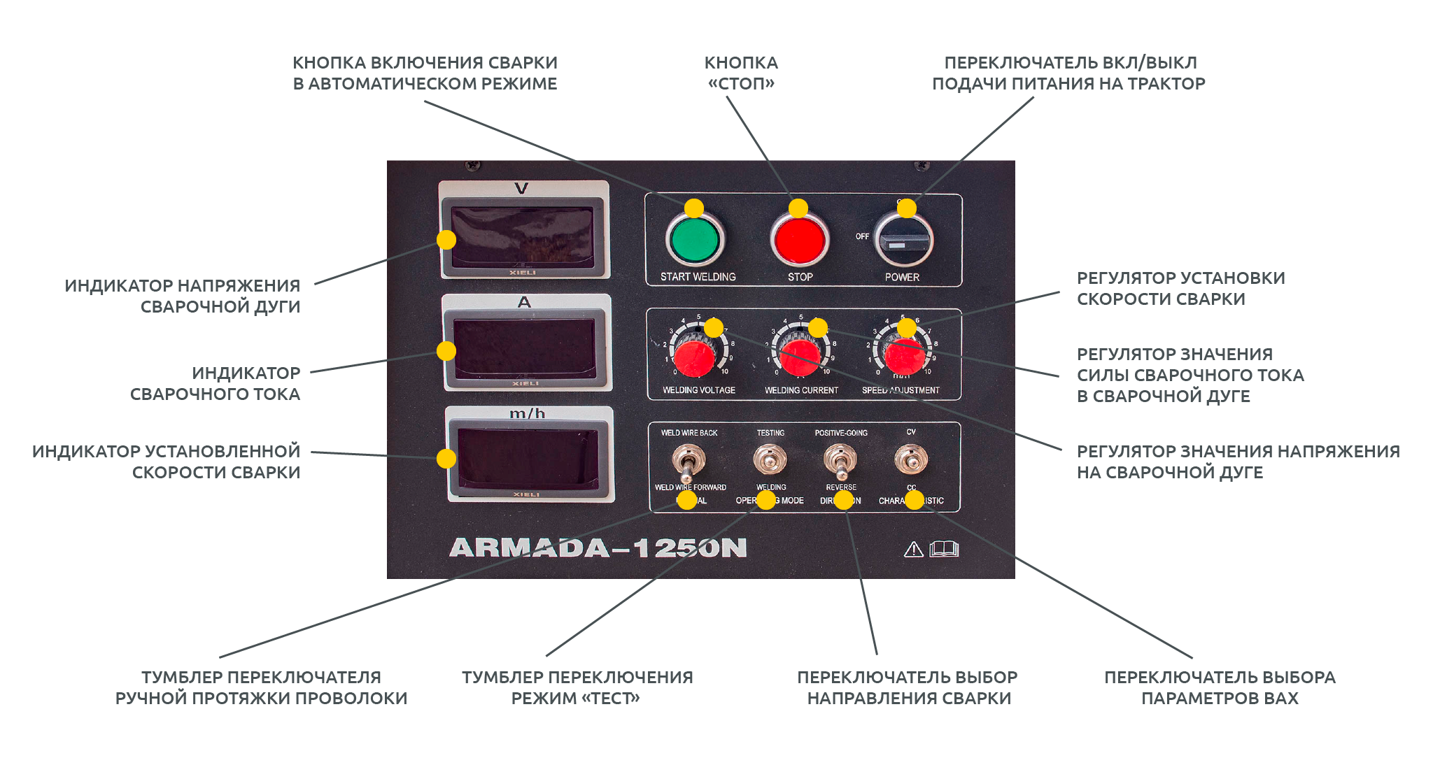 Сварочный трактор HUGONG ARMADA 1250N 029647 Промышленный многофункциональный сварочный аппарат для автоматической сварки под флюсом (SAW) с функцией ручной дуговой сварки покрытым электродом (ММА) и воздушно-дуговой строжки (Googing). Источник сварочного тока в составе аппарата обеспечивает сварочные процессы с жесткой ВАХ «CV» (Constant Voltage) и падающей ВАХ «СС» (Constant Current) при 100% ПВ с током сварки до 1 250 А. Возможно выполнение сварных изделий из всех видов стали с толщинами от 3 до 350 мм