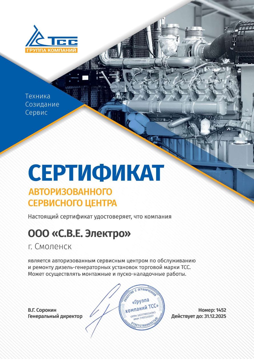 ООО С.В.Е. Электро является авторизированным сервисным центром по обслуживанию и ремонту дизельных генераторов торговой марки ТСС по г. Смоленск, Смоленская область