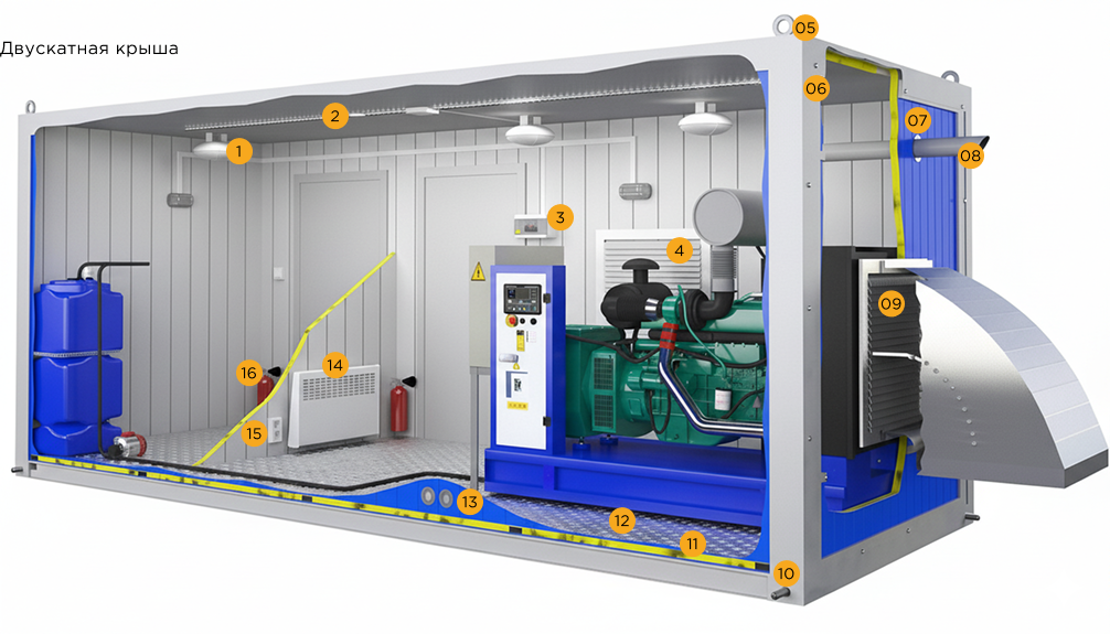 Стандартный блок-контейнер обеспечивает работу дизельного генератора в диапазоне внешних температур от -40 °С до +40 °С.